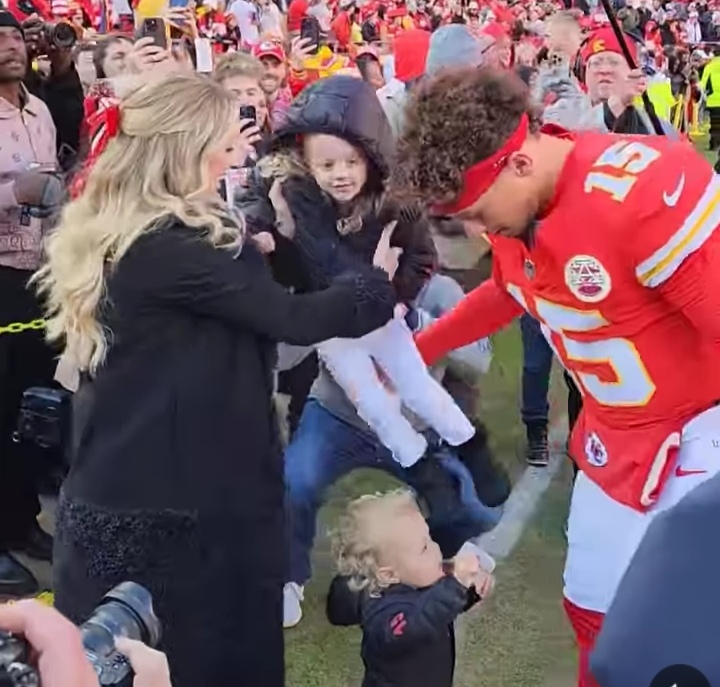 Brittany stood proudly with their daughter, Sterling, and baby Bronze, who reached out to his dad with an infectious sense of excitement. The image of Mahomes leaning down to connect with his little ones underscores his devotion not only to the game but to his role as a father.